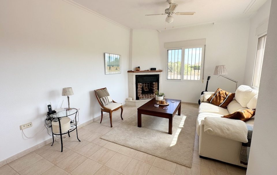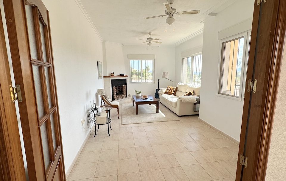 Von der Naya aus gelangen Sie in die zentrale Diele. Zu Ihrer Rechten befindet sich das offene Wohn- und Esszimmer mit einem Kamin. Dieser helle und einladende Raum bietet einen Blick auf den Pool und wird vor allem in den Wintermonaten genutzt.