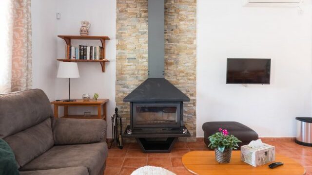 La casa tiene un salón-comedor con cocina abierta, 4 dormitorios y 1 baño familiar. En el salón hay una chimenea de leña y aire acondicionado frío/calor.