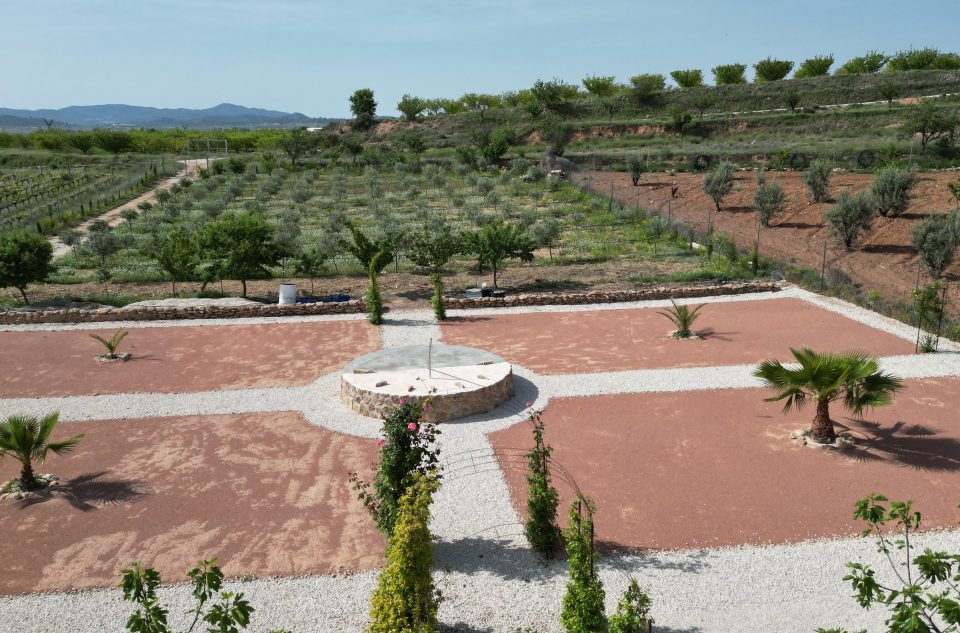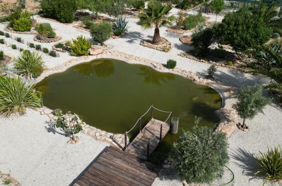 Le terrain est plat, entièrement clôturé et soigneusement aménagé en plusieurs zones. Il comprend une oliveraie d’environ cent vingt-cinq arbres, des jardins paysagers avec bassin et volière, ainsi qu’un verger productif avec une grande variété d’arbres fruitiers. Des pommiers et poiriers aux agrumes et amandiers, le cadre évolue au fil des saisons.