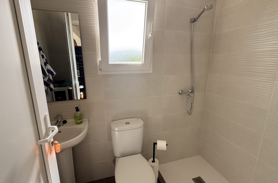 La villa se compose de deux niveaux accessibles par un porche couvert. Le rez-de-chaussée comprend un grand salon ouvert avec cheminée, une salle à manger et une cuisine moderne avec îlot et buanderie. Une chambre double, une salle d’eau et des rangements complètent ce niveau.