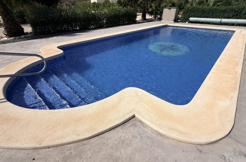 La propriété bénéficie de l’eau potable, d’un système d’irrigation économique et d’une alimentation électrique de six kilowatts. Elle est complétée par douze panneaux solaires, un onduleur et des batteries. La piscine de cinquante mètres carrés peut fonctionner au sel ou au chlore.
